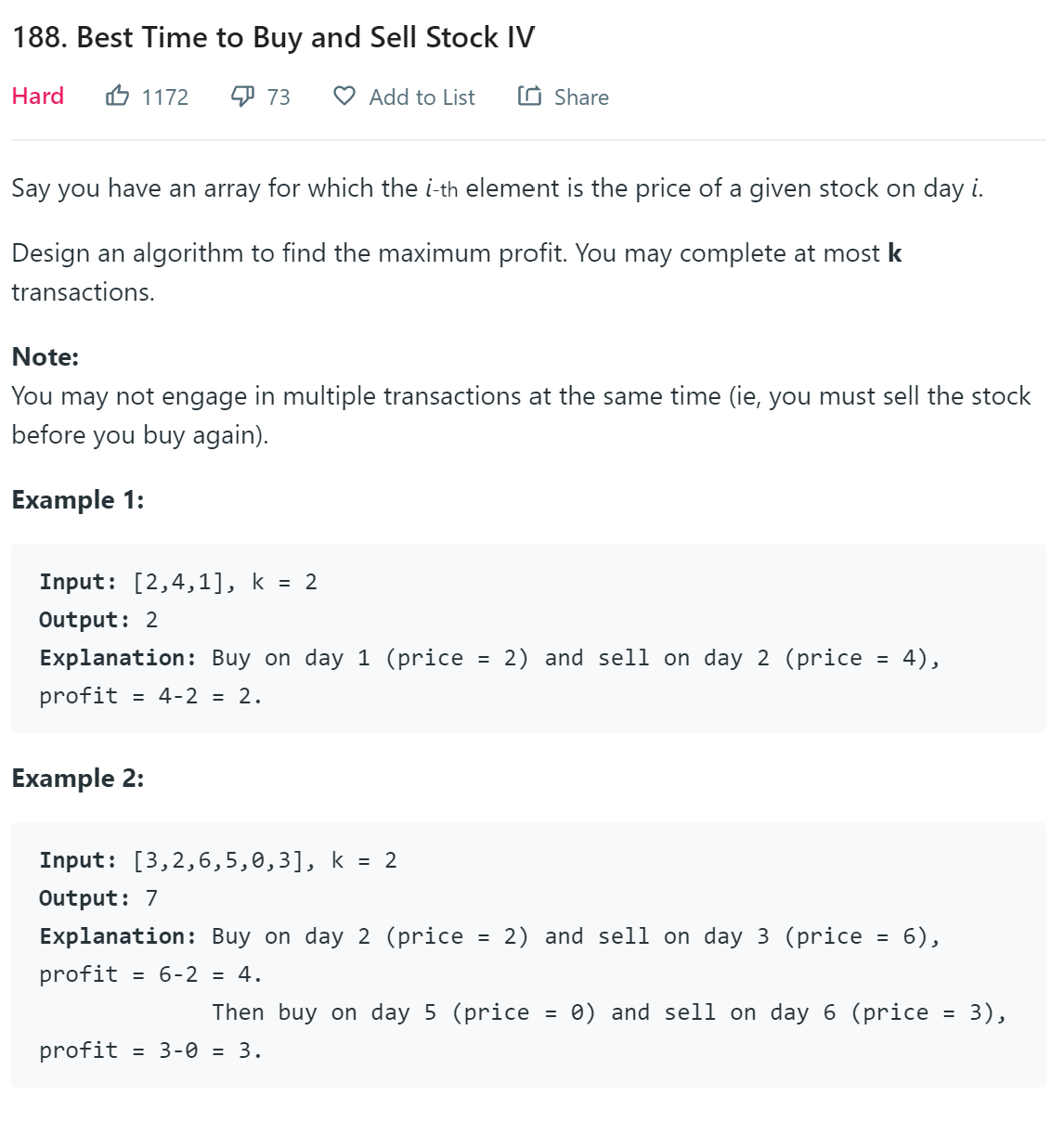 The first problem is that only one transaction is performed, which is equivalent to k = 1. The second problem is that the number of transactions is unlimited, which is equivalent to k = +infinity (positive infinity). The third problem is that only two transactions are performed, which is equivalent to k = 2. The remaining two are also unlimited, but the additional conditions of the “freezing period” and “handling fee” for the transaction are actually variants of the second problem, which are easy to handle.