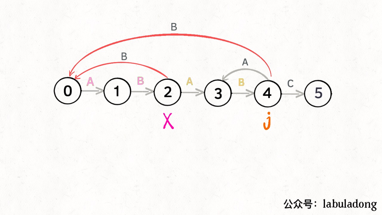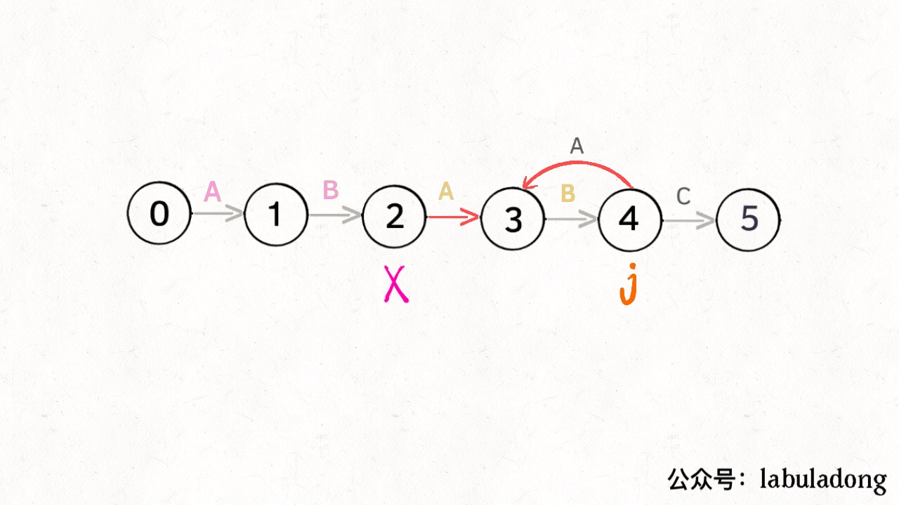 matching pat[1.end], state X is always one state behind state j, with the