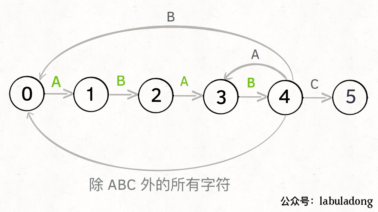 If the character “C” is encountered, it should transition to the termination state 5 according to the arrow, which means that the match is complete: