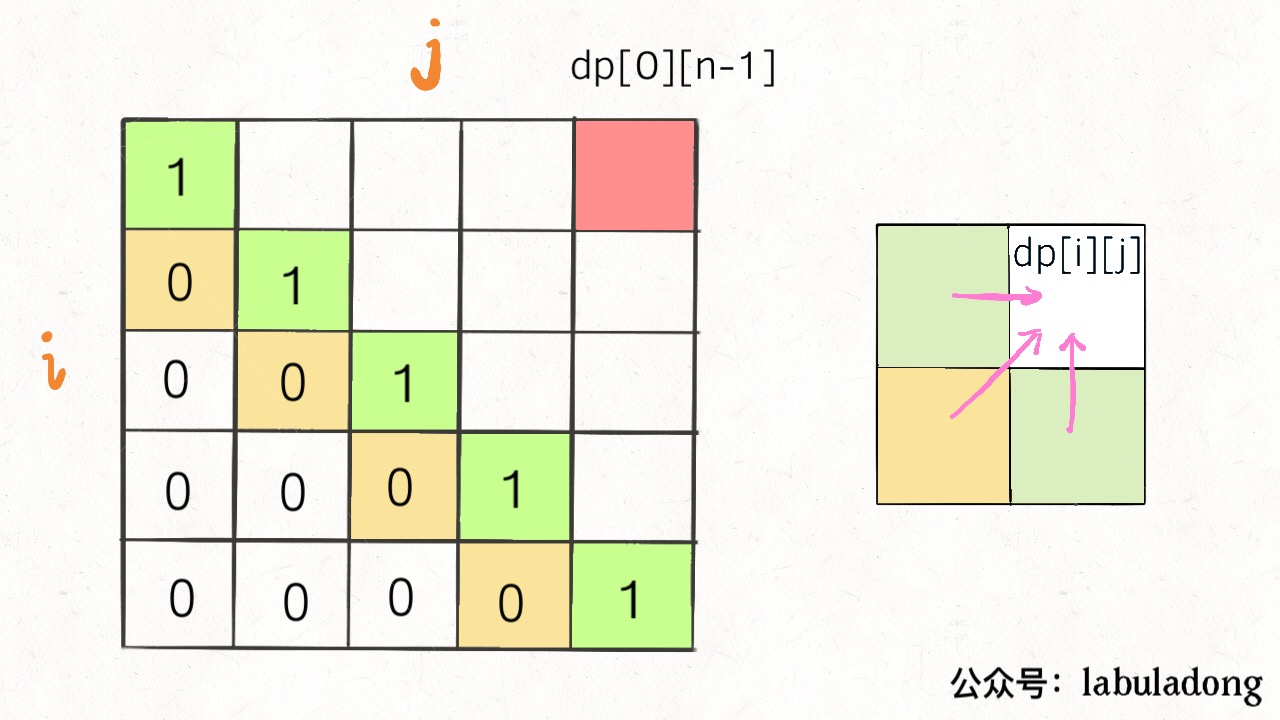 the middle of diagonal of the array. dp[i][j] is derived from dp[i+1][j],